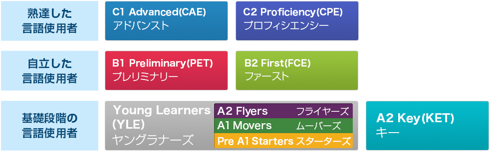 ケンブリッジ英語検定の種類は、下記のカテゴリーに分けることができ、学習者の多様なレベルの英語運用能力を測るのに適した試験を展開しています。