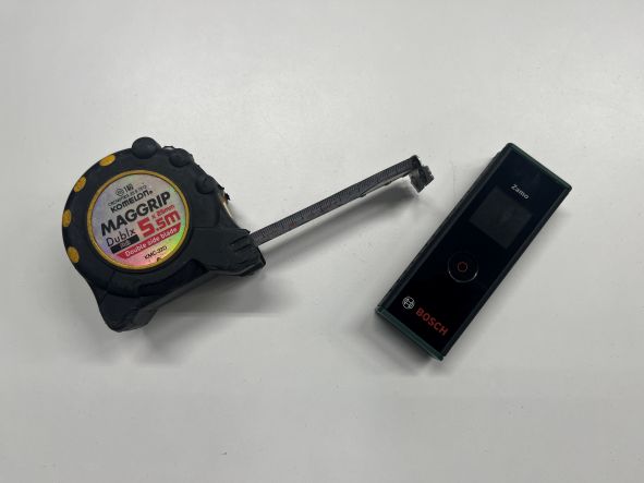 メジャーとレーザー距離計です。校舎のレイアウト変更の検討時や既存の什器のサイズ測定など多くの場面で使用しています。