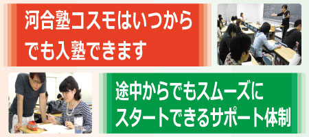 河合塾コスモはいつからでも入塾でき、講師・スタッフのサポートやオンライン利用の受講により、スムーズなスタートをきることができます。