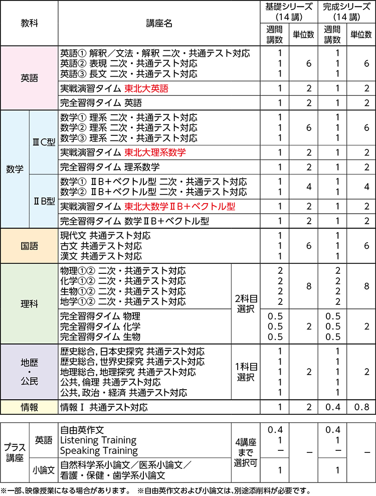 共通テストで高得点を取るための基礎学力を養成し、東北大の二次試験で求められる高度な学力と表現力をバランスよく鍛えるコースです。
