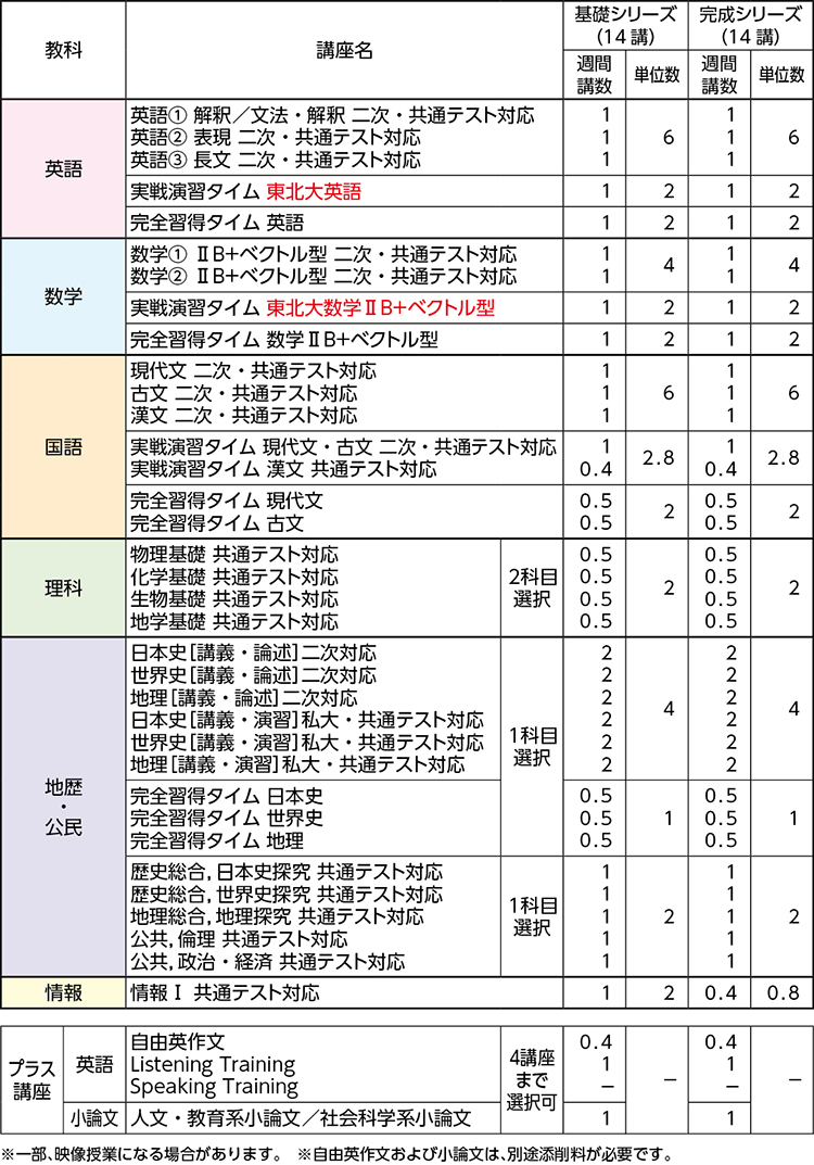 共通テストで高得点を取るための基礎学力を養成し、東北大の二次試験で求められる高度な学力と表現力をバランスよく鍛えるコースです。