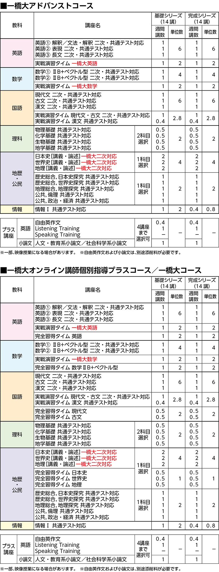 一橋大コースに「アドバンストゼミ」、「先制攻略セミナー」、「実戦演習テスト」が付いたコースです。