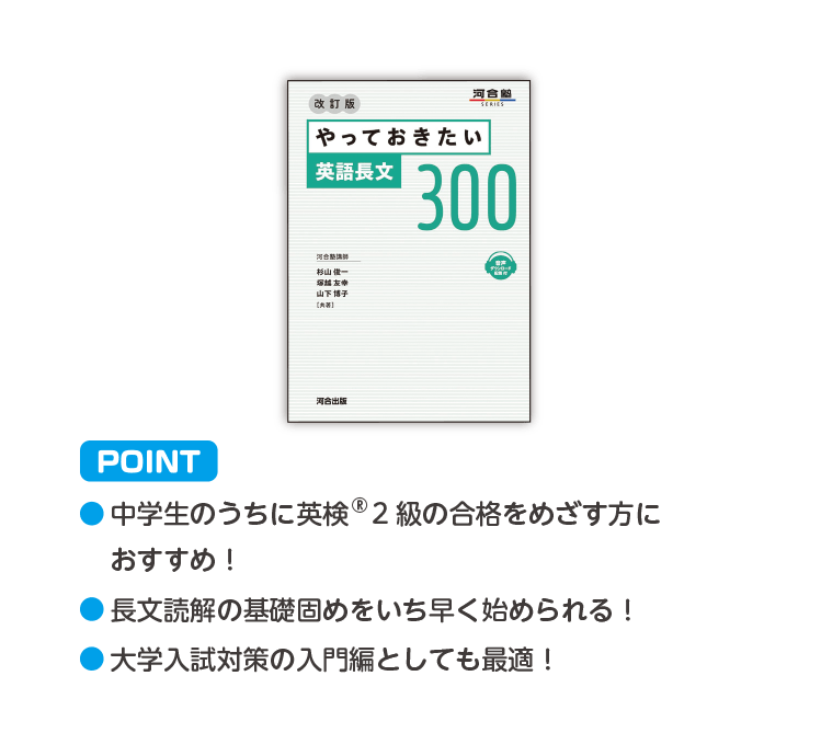 基礎から標準レベルの英語長文を30題掲載。本文音声付きでリスニング対策もばっちり。頻出単語も多く、基礎固めや大学受験の長文対策ができます。