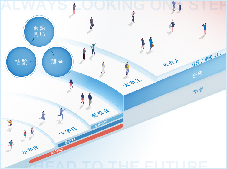 大学生からは「絶対的な解」が存在しない自ら問いや仮説を立てる「研究」が加わりますが、研究の方法を教えてもらえるタイミングがないことがほとんど。